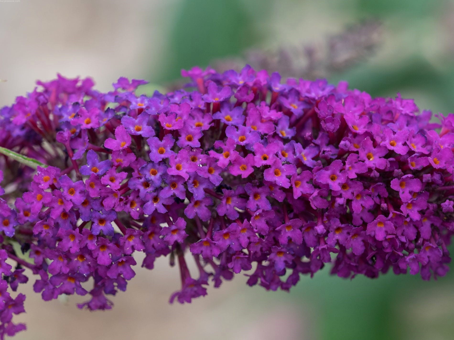 Kwiaty i liście: kwiaty są zebrane w długie, smukłe wiechy o długości do 30 cm, które rozwijają się na wierzchołkach tegorocznych pędów. Mają intensywnie purpurowy kolor i przyjemny zapach, który przyciąga motyle. Kwitnienie trwa od lipca do września. Liście są wąskie, szarozielone, pokryte delikatnym nalotem, co dodaje roślinie subtelnej elegancji.