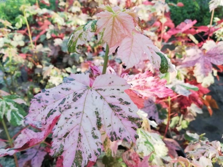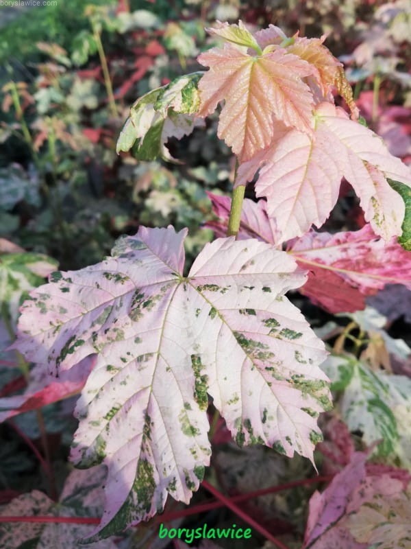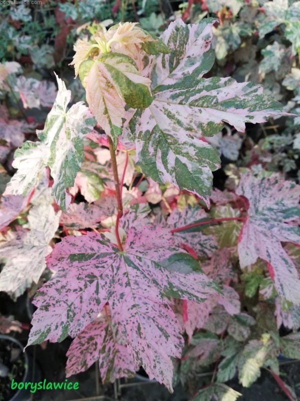 Liście: liście są duże, klapowane, wyjątkowo dekoracyjne. Wiosną pojawiają się z odcieniami różu i kremowego marginesu, przechodzącymi w zielone wzory z delikatnymi, białymi i różowymi przebarwieniami. Spód liści jest intensywnie purpurowy, co nadaje roślinie dodatkowej atrakcyjności. Jesienią liście przebarwiają się na złociste odcienie, dodając ogrodowi ciepłych barw.